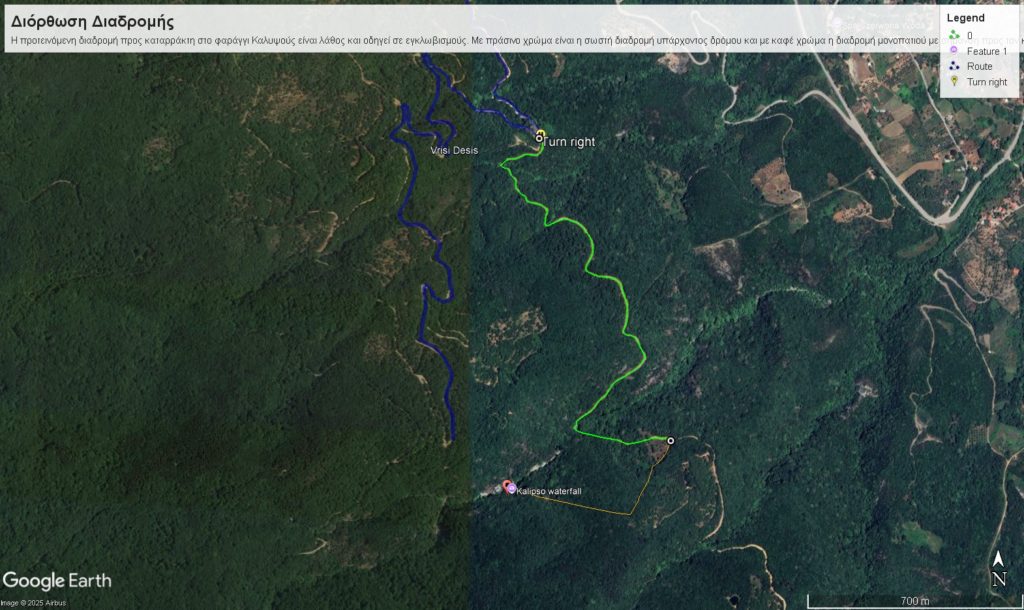 - Αφού περάσουμε και την δεύτερη ράμπα νερού με τσιμέντο, θα δούμε στα 300μ στα δεξιά μας μια πινακίδα για το μονοπάτι Καλυψούς. Εκεί θα αφήσουμε το αυτοκίνητο και θα κατευθυνθούμε προς το μονοπάτι.