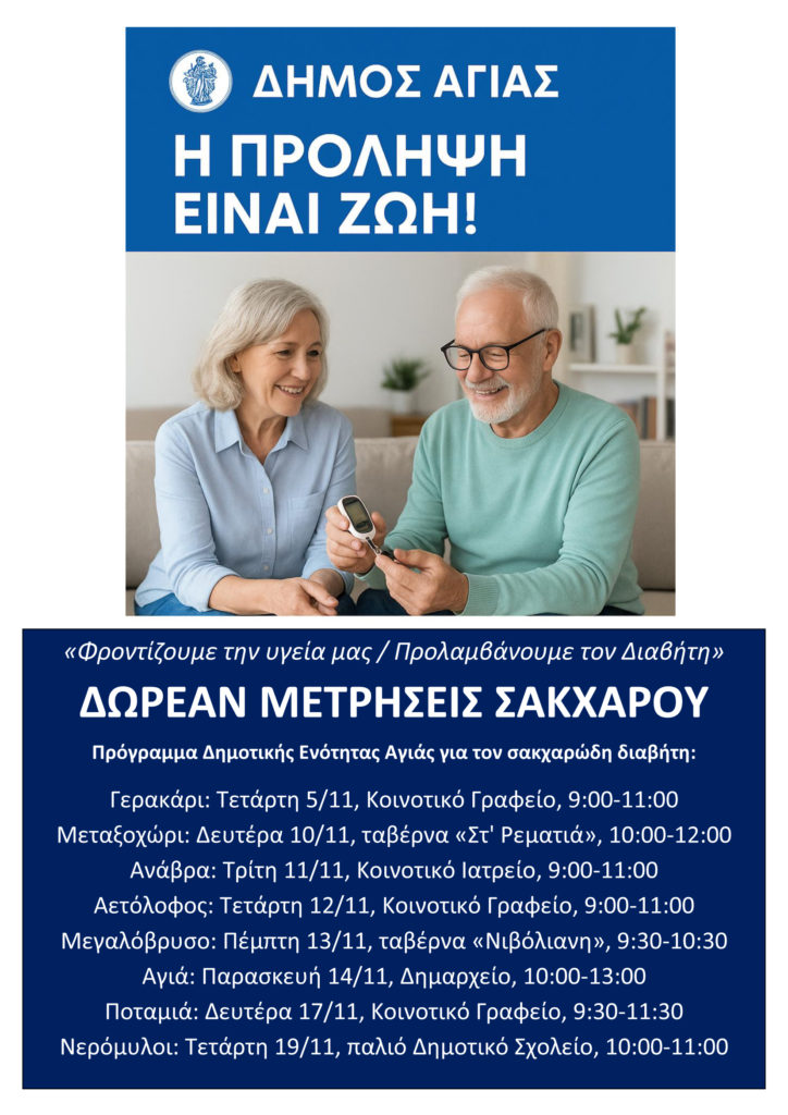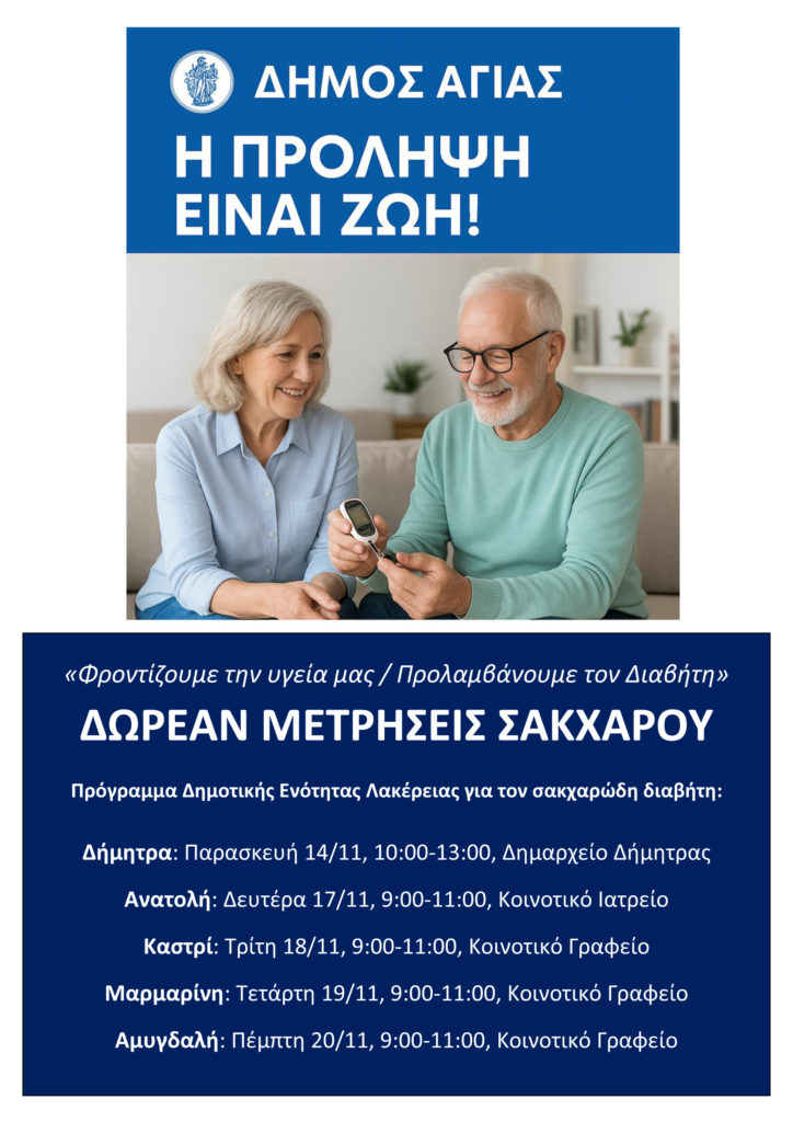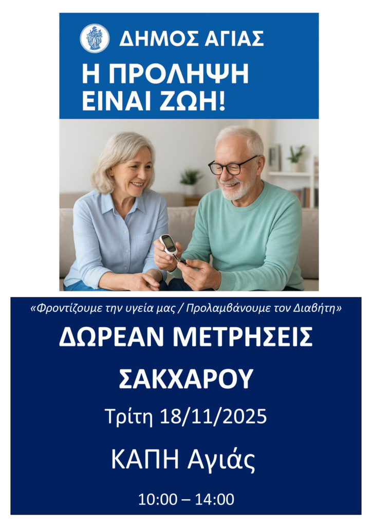 Στο πλαίσιο της ευαισθητοποίησης και ενημέρωσης των συνανθρώπων μας για την αυξανόμενη απειλή που προκαλεί ο διαβήτης στην υγεία και με αφορμή την Παγκόσμια Ημέρα Διαβήτη, η Δ/νση Κοινωνικής Πρόνοιας, Παιδείας, Πολιτισμού, Αθλητισμού και Εξυπηρέτησης του Πολίτη Δήμου Αγιάς, διοργανώνει το μήνα Νοέμβριο, δράσεις δωρεάν μέτρησης ζωτικών σημείων (αρτηριακής πίεσης, σακχάρου) στις κατά τόπους Δημοτικές Ενότητες του Δήμου, έχοντας σαν σκοπό να αναδείξει την ανάγκη προληπτικού ελέγχου υγείας των δημοτών που θα πραγματοποιηθούν από το Τμήμα «Βοήθεια στο Σπίτι» της κάθε Δημοτικής Ενότητας του Δήμου Αγιάς.