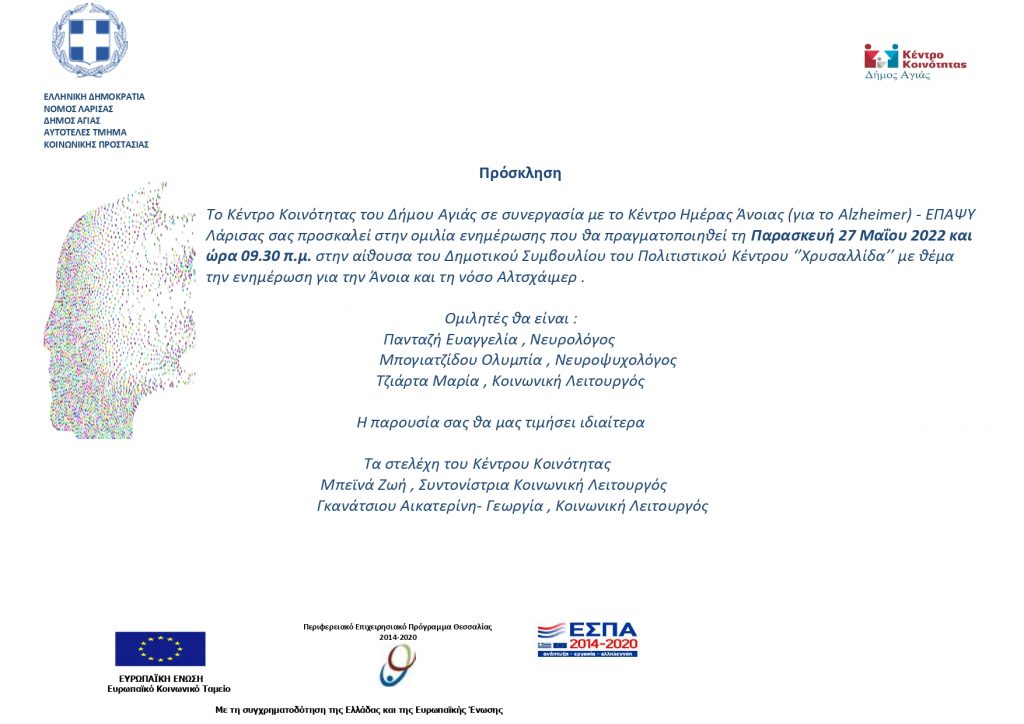 Το Κέντρο Κοινότητας του Δήμου Αγιάς σε συνεργασία με το Κέντρο Ημέρας Άνοιας (για το Alzheimer) – ΕΠΑΨΥ