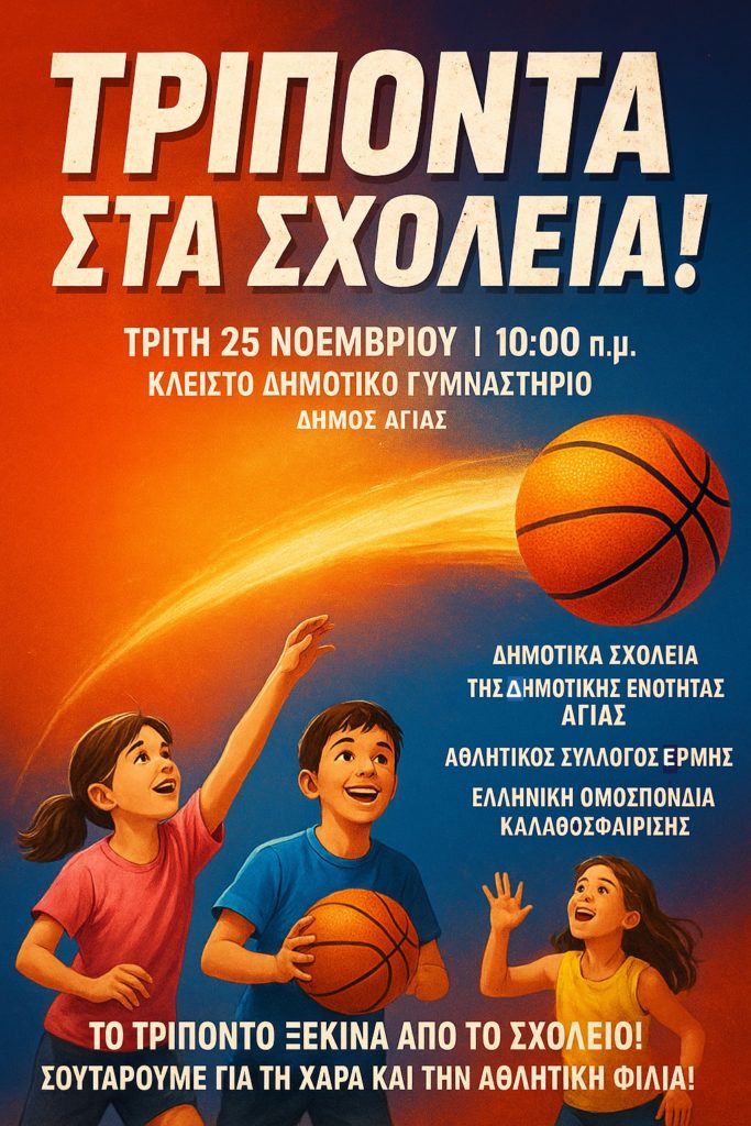 Ο Αθλητικός Σύλλογος “ΕΡΜΗΣ” με την Ελληνική Ομοσπονδία Καλαθοσφαίρισης και τα Δημοτικά σχολεία της περιοχής σε συνεργασία με τον Δήμο Αγιάς και την Διεύθυνση Κοινωνικών Υπηρεσιών, Αθλητισμού, Παιδείας, Πολιτισμού κι  Εξυπηρέτησης του Πολίτη  , διοργανώνουν με ιδιαίτερη συγκίνηση και υπερηφάνεια τη μεγάλη αθλητική δράση «Τρίποντα στα Σχολεία», μια γιορτή που ενώνει τα παιδιά, τους εκπαιδευτικούς, τους προπονητές και την τοπική κοινωνία μέσα από τη δύναμη του αθλητισμού.