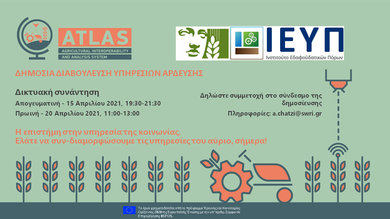 Ο Δήμος Αγιάς και το Ινστιτούτο Εδαφοϋδατικών Πόρων του Ελληνικού Γεωργικού Οργανισμού “ΔΗΜΗΤΡΑ”, προσκαλούν παραγωγούς, γεωπόνους και παραγωγικούς φορείς του Δήμου στη διαβούλευση για τις υπηρεσίες άρδευσης, που αναπτύσσονται σε συνεργασία με τις ερευνητικές ομάδες του Εθνικού Αστεροσκοπείου Αθηνών και του Ερευνητικού κέντρου Jülich της Γερμανίας, στο πλαίσιο του έργου H2020 ATLAS. Στην διάρκεια της […]